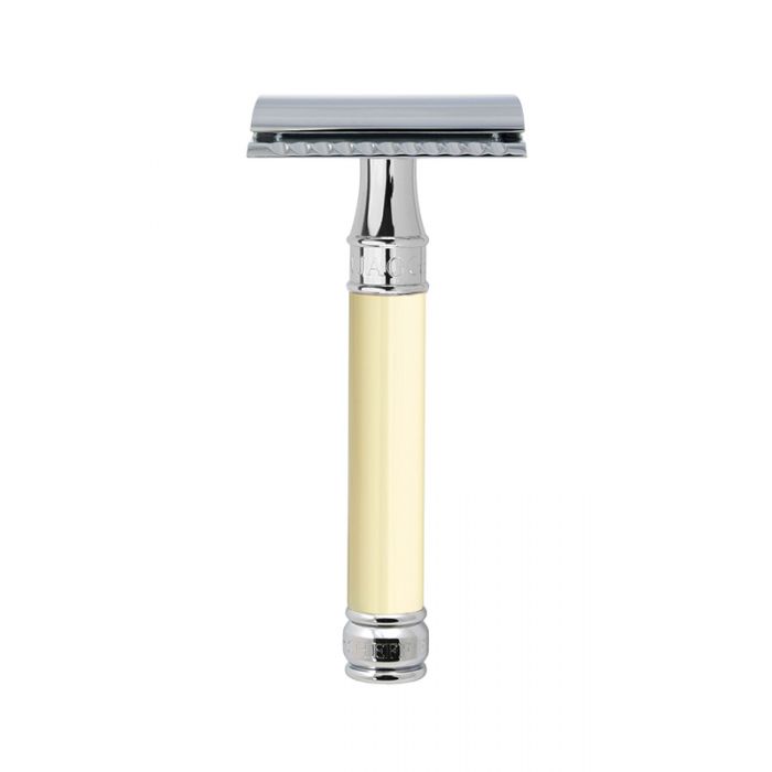 Rasoio di sicurezza con testina a pettine chiuso ed impugnatura liscia in poliestere di colore avorio.