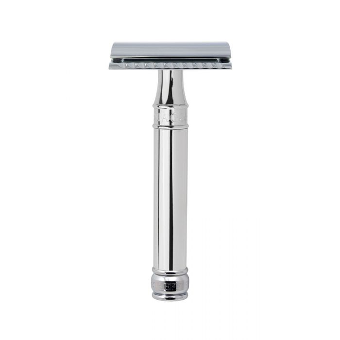 Rasoio di sicurezza con testina a pettine chiuso ed impugnatura cromata lucida completamente liscia