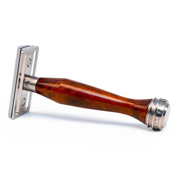 Il nuovo rasoio di sicurezza Radica Tuya a guardia chiusa firmato Saponificio Varesino, progettato per lamette Double Edge, incarna la quintessenza dell’artigianato italiano. Lanciato con grande entusiasmo alla fiera SANA di Bologna nel 2023, si distingue per la sua testina e il sofisticato decoro Corona SV, magistralmente forgiati in acciaio inox 303.